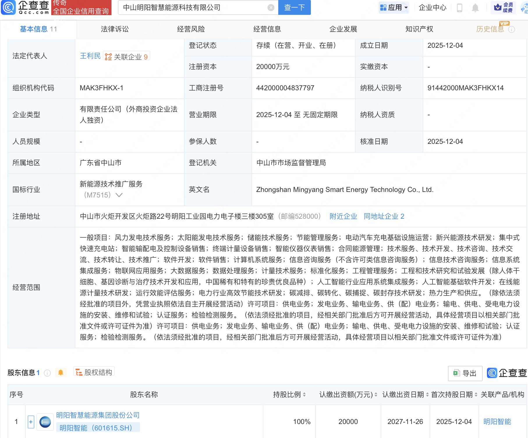 近日,中山明阳智慧能源科技有限公司成立,法定代表人为王利民,注册资本2亿元,经营范围包括风力发电技术服务、太阳能发电技术服务、储能技术服务、节能管理服务、电动汽车充电基础设施运营等。企查查股权穿透显示,该公司由明阳智能(601615)全资持股。