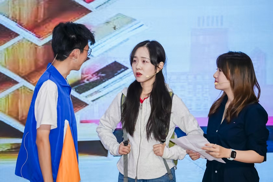 以创新引擎,多维展示青年宣讲的实践成果。活动注重经验提炼与前瞻思考,浦东检察院的徐昊分享了案例报告《新时代新技术背景下浦东青年讲师团能力提升的路径研究》,包含了八周训练中31位学员的个人示范宣讲和金融、科创、社会治理、法治、文化5个小组情景演绎,为后续工作提供了扎实的学理支撑和方法路径,体现了“实践-总结-再提升”的良性循环。本次活动更是一次方法创新的集中演练。5个小组学员代表在各组情景演绎的基础上,共同创排了融合情景剧《一章与一诺》,剧本融合AI创新,将青年宣讲的理论要点转化为戏剧冲突,以生动的情节诠释了浦东各行业青年对责任与承诺的思考,对浦东的热爱与奋进。