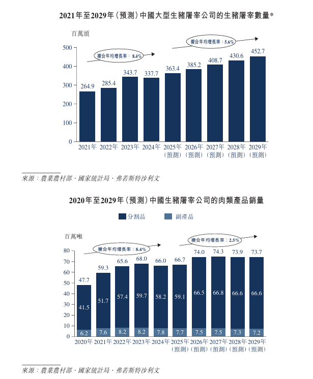 按中国大型生猪屠宰公司屠宰的生猪量计,于2021年至2024年,屠宰量稳定增长,由2021年的264.9百万头增加至2024年337.7百万头。展望未来,随着大型屠宰公司的进一步渗透,屠宰量预计将逐步由2025年的363.4百万头增加至2029年的452.7百万头,2025年至2029年的复合年均增长率为5.6%。