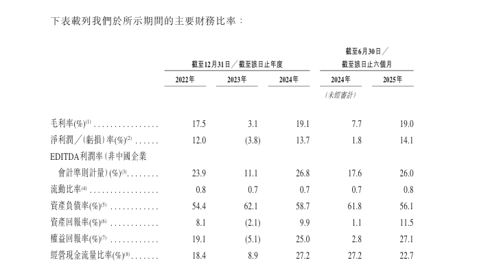 于2022年、2023年、2024年及截至2025年6月30日止六个月,公司毛利率分别为17.5%、3.1%、19.1%及19%。